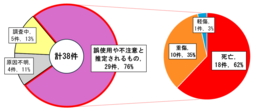 除雪機により人的被害があった事故38件について、「原因別の事故発生件数」を図2に示します。約8割(調査中の案件を除くと約9割)が安全機能を無効化するなど「誤使用や不注意と推定されるもの」の事故となっています。誤使用や不注意による事故で多くの死亡・重傷事故が発生しています。