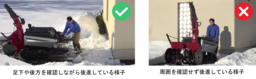 事故の中には、シーズン前の試運転で事故に遭われているケースもあります。『操作には慣れているから』『今まで事故になっていないから』といって油断することなく、使い始める前に危険な使い方をしていないか今一度確認し、安全に正しく除雪機を使いましょう。
