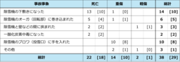 除雪機により人的被害があった事故38件について、「事故事象別・被害状況別の事故発生件数」を表2に示します。死亡事故は「除雪機の下敷きになった」、「除雪機のオーガ(回転部)に巻き込まれた」の2つの事象で多く発生し、重傷事故は「除雪機のブロワ(投雪口)に手を入れた」事象で多く発生しています。