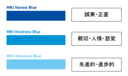 今回のロゴをデザインするにあたり、コーポレートカラーも新しくし、誠実さや正直さを表す深いブルー「MKI Honest Blue」と定義しました。また、三井情報ブランドの独自性を強調するため、コーポレートカラーと組み合わせて活用する2色のプライマリーカラー(MKI Kindness Blue / MKI Advanced Blue)も設定しました。それぞれのカラーには、三井情報が大切にしている想いがキーワードに込められています。