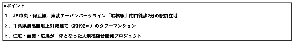大和ハウス工業株式会社(本社:大阪市、社長:大友浩嗣)は、東京建物株式会社と京成電鉄株式会社と共同で、千葉県船橋市の「西武船橋店本館」跡地において、分譲マンション「プレミストタワー船橋」(地上51階・地下1階建て、総戸数677戸)を建設中ですが、概要が決定しましたのでお知らせします。
