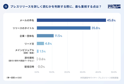 受信したプレスリリースを「詳しく読み進めるか」を判断する際に、【最も重視する点】について伺いました。最も重要視されているのは「メールの件名」(45.8%)で、続いて「プレスリリースのタイトル」(35.8%)、「企業・団体名」(11.5%)という結果になりました。