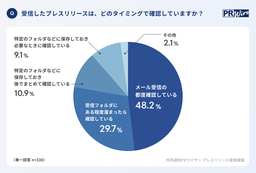 メールで受信したプレスリリースについて、どのタイミングで開封・確認しているのかを伺いました。メールで受信したプレスリリースを確認するタイミングは「メールの都度、開封している」が48.2%で約5割となりました。続いて「受信フォルダにある程度溜まったら確認している」が29.7%で約3割という結果になりました。