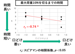 オーラルマップス®から得られた指標のうち、繰り返し圧縮時の最大荷重が10Nを下回るまでの時間、および同じく20Nを下回るまでの時間という2つの指標で官能評価結果との間に有意な相関が認められ、最も高い相関であった指標は最大荷重が10Nを下回るまでの時間でした。
