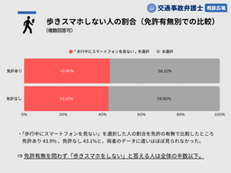 一方、歩きスマホをしない(歩行中にスマートフォンを見ない)と回答した人は4割程度に留まりました。