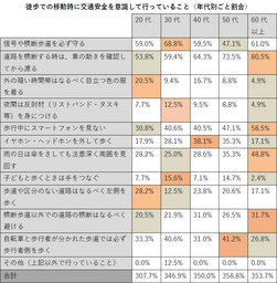 徒歩時は「信号・横断歩道の遵守」「道路を横断する時は、車の動きを確認してから渡る」など基本行動の実践率は高く、全世代でおおよそ50%以上が行っていました。