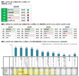 2025年に食べる機会が多かった野菜の1位「キャベツ(52.5%)」、2位「たまねぎ(48.5%)」は昨年と変わらず、4位「トマト(41.5%)」とともに2022年から4年連続でトップ5にランクインとなっています。