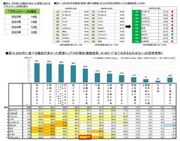 6、7位には、昨年4、5位の定番野菜である「きゅうり(39.8%)」「なす(38.0%)」が続いています。