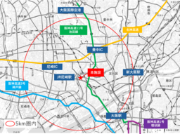 また、本施設が位置する淀川区は、人口・世帯数ともに大阪市内最大(※3)で、本施設の周辺5㎞圏内には約81万人が居住しており、物流施設の雇用確保やラストマイル配送にも有利な立地です。10 ㎞圏内には大阪梅田等の大阪中心エリアや、工場が集積する尼崎エリアがあり、また、阪神高速11号池田線「加島料金所」まで約2.2㎞、名神高速道路「尼崎IC」まで約4㎞、名神高速道路「豊中IC」まで約5.4㎞(※4)と関西全域への配送に非常に適しています。加えて、本施設はJR東西線「加島」駅から徒歩約4分と、従業員の通勤利便性に非常に優れています。