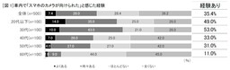 その結果、車内で「他人のスマホのカメラが自分に向けられているかもしれない」と感じた経験がある人は、全体の35.4%でした。また、20代以下は49.0%、30代は53.0%と約半数が「経験がある」と回答し、若い世代ほど他人のスマホのカメラレンズの向きに対する意識が高いことが分かりました[図1]。
