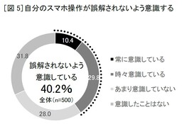 車内でスマホを操作する際、自分が「他人を勝手に撮っていると誤解されているかもしれない」と感じた経験を聞くと、全体の24.6%と約4人に1人が「経験がある」と回答[図4]。続いて、誤解されないようスマホの使い方を意識しているかと聞くと、40.2%が「意識している」と答えました[図5]。