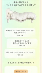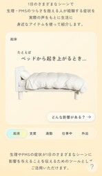 人それぞれ異なる生理・PMSに伴う症状や、その症状による日常への影響を、つらさを抱える人の実際の声を基に可視化したコンテンツです。起床や身支度、外出など、1日のさまざまなシーンに当てはめながら、「“いつも通り”にいかない1日」をCGイラストで表現しています。また、産婦人科専門医からの解説も掲載することで、症状を分かりやすく理解できるような構成にしています。つらさを抱えている人だけでなく、それぞれの症状の経験がない人にとっても、経験していないからこそ想像しづらい症状や、それによるつらさ、影響について、目で見て理解を深められる内容になっています。(チャプター3「想像する」)