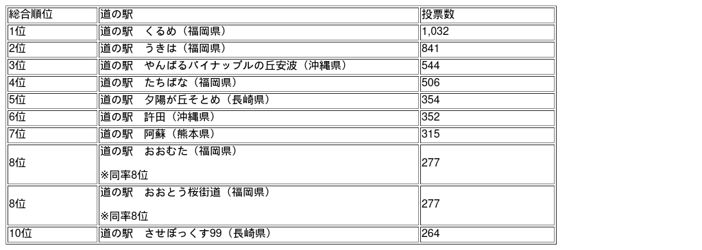 第11回目となる今年も昨年に引き続き、「グルメ部門」「行ってみたい部門」「おもてなし部門」の3部門それぞれに投票いただき、その結果合計1,032票を獲得した「道の駅 くるめ(福岡県)」が初めての総合1位となりました。道の駅くるめをイチオシにした投票コメントには「ソフトクリーム屋さんのスタッフが優しく、直売所のスタッフも気さくで優しかった(30代女性)」と施設スタッフの温かい対応を評価する声が多数寄せられました。