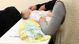 新生児用肌着の種類とお着替えを赤ちゃん人形を使って実際に体験。大人の洋服と違い、肌着の種類や紐が多いことに戸惑う方もいらっしゃいました。