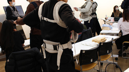 妊娠8~9か月の重さを再現したジャケットを着用し、足元の見えにくさや立ち座りのしづらさを体験。実際にジャケットを着用し、 マットに寝転がってみた参加者は、思うように動けないことに驚いていました。