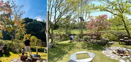 さらに、「出来上がってみると、石積みが思った以上にかっこよく、とても気に入っています。また、ハンモックを掛けられる立派な樹木が欲しかったので山下さんと一緒に、木の畑まで一緒に見に行き選びました。アオダモと、幹の太いヤマモミジの木陰でゆったりと過ごせ、自然の中でくつろげるようになりました。」と話してくださいました。