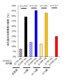 参加者79人中49人(62%)がメトホルミンを使用していました。そこで、メトホルミンの投与量で層別化(750 mg/日以下:26人、1,000 mg/日以上:23人)したところ、1,000 mg/日以上で有意に消化器系有害事象が高頻度でした(図2参照)。メトホルミンの化学構造がイメグリミンと類似していることが、副作用増加の一因と考えられます。