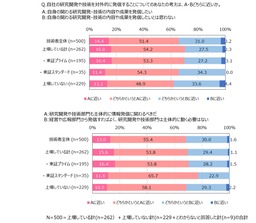 自社の研究開発や技術情報の対外的な発信(技術広報)が、「以前より積極的になってきていると思う」と回答したのは全体で35.2%。上場市場別で見ると、東証プライム企業(「以前より積極的になってきていると思う」45.6%)、東証スタンダード企業(同40.0%)上場していない企業(22.7%)と、上場している企業と上場していない企業では、約20ポイントの差があることが明らかになりました。