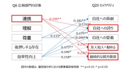 ーまた、(重回帰分析:それぞれ標準偏回帰係数 0.199、0.251、0.236、p<0.01) 「自社へのロイヤリティ」(関連の5項目を1因子として統合)にもつながっていることを示しています。