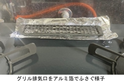 グリル排気口は、グリル庫内の煙や熱を外に逃がすためのものです。汚れの付着を防ぐ目的であっても、市販の排気口カバーやアルミ箔などで排気口をふさいでしまうと、異常燃焼による一酸化炭素中毒や火災・機器の焼損につながるおそれがあります。