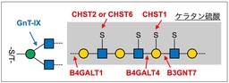 ケラタン硫酸は、B4GALT1、B4GALT4、B3GNT7、CHST1、CHST2、CHST6など複数の酵素によって作られる長い糖鎖です (図3) 。ケラタン硫酸を作るこれらの酵素の働きと、O-Man型糖鎖の根本の枝分かれの有無についてはこれまでわかっていませんでしたが、GnT-IXの欠損によりケラタン硫酸が大きく減少したことから、これらの酵素は直鎖よりも枝分かれした O-Man型糖鎖に働きやすい可能性が考えられました。