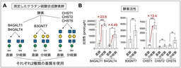 そこで、これら6種類のケラタン硫酸合成酵素をそれぞれ精製し、直鎖と分岐鎖のO-Man型糖鎖を基質 10)として用いた酵素反応を行い、酵素活性が枝分かれの有無で異なるかどうかを調べました(図4A)。その結果、特にB4GALT1、B4GALT4、CHST1については、直鎖よりも分岐鎖に対して著しく高い活性を示すことがわかりました (図4B) 。このことから、O-Man型糖鎖がGnT-IXによって枝分かれすると、ケラタン硫酸の合成酵素が働きやすくなり、多くのケラタン硫酸が作られます。したがって、GnT-IX KOマウスの脳でケラタン硫酸が減少したのは、O-Man型糖鎖の枝分かれがなくなって、ケラタン硫酸合成酵素が働きにくくなったためと考えられます。