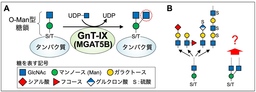 4)O-マンノース型糖鎖:タンパク質に付く糖鎖の種類の1つで、タンパク質のセリン残基(アミノ酸の1文字表記法でSと表記)もしくはスレオニン残基(1文字表記でT)にマンノース(Man)という糖が結合している。この糖鎖の形成異常はある種の筋ジストロフィーの原因となる。GnT-IXはこの糖鎖の分岐構造を作る。