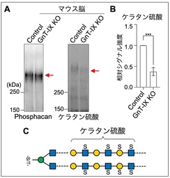 まず、GnT-IX KOマウスの脳を用い、O-Man型糖鎖の先に伸びる糖鎖構造について調べました。その結果、伸びた糖鎖の末端に存在する構造の一つで、ケラタン硫酸8)と呼ばれる構造が、GnT-IX KOマウスで大幅に減少していることがわかりました(図2A, B)。ケラタン硫酸は、脳や角膜などに多く存在する、繰り返し構造を持つ長い糖鎖で(図2C)、Phosphacan9)など特定のタンパク質の糖鎖にのみ存在しています。また機能的には、脳において神経の再生を抑制する働きがあることなどがわかっています。本研究により、脳においてケラタン硫酸が正常に作られるためには、O-Man型糖鎖の枝分かれが必要であることがわかりました。このことから、GnT-IXが作る枝分かれ構造は、O-Man型糖鎖の伸長を促進する働きがあることが示唆されました。