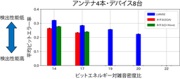 青がLMMSEで、赤がSQAによる計算結果。グラフが下にいくほど検出性能が高い。