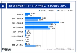 「Q9.過去1年間の投資パフォーマンス(利回り)はどの程度でしたか。」と質問したところ、エンジニア(n=200)は「10%~20%未満」が39.0%、非エンジニア(n=200)は「10%〜20%未満」が29.5%という回答となりました。