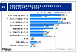 Q9で「0%~10%未満」「10%~20%未満」「20%~30%未満」「30%以上」と回答した方に、「Q10.あなたが投資で成果を上げた要因として当てはまるものを全て教えてください。(複数回答)」と質問したところ、エンジニア(n=181)は「早期に将来性を見抜いたこと」が37.0%、非エンジニア(n=155)は「じっくり長期保有したこと」が41.9%という回答となりました。