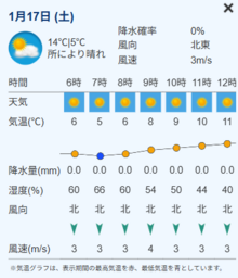 試験1日目、2日目それぞれの天気や気温、降水確率、服装のアドバイスがわかります。さらに、日にち部分をタップすると、1時間ごとの天気・気温・降水量・湿度・風向・風速といった詳細が見られます(PCの場合は画面下部に掲載)。天気は1時間ごとに更新されるので、ブックマーク登録しておくのもおススメです。