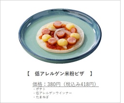低アレルゲンメニューとして、ハンバーグをメインに、ごはん・ウインナー・おやさい(ポテト・人参・コーン)・おこさまゼリー・ドリンクをおもちゃ付きでセットにした「低アレルゲンお子さまランチ」と、「低アレルゲン米粉ピザ」をコラボ開発しました。