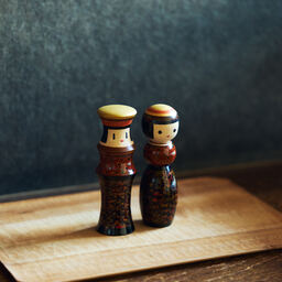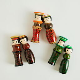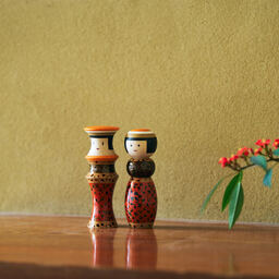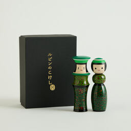 漆を何層も塗り重ね、研ぎ出すことで生まれる美しい模様が特徴の青森県の伝統工芸「津軽塗」。2体がぴったりと寄り添う「ルビンのこけし ペア」に、津軽塗の独特技法で生み出される4種の柄の中でも、複雑な斑点模様を描く「唐塗」を施しました。約50もの工程を、すべて手仕事で丁寧に仕上げた逸品です。