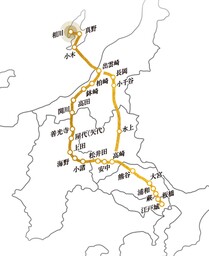「金の道」とは江戸時代に佐渡で産出された金銀を江戸まで運んだルートです。現在の新潟県佐渡市相川地区から―小木地区、そして海路を挟み、新潟県出雲崎港に陸揚げされてからは主要ルートである北国街道、追分宿(現在の軽井沢)から中山道を経て最終地江戸日本橋までを結んだ道が「金の道」です。