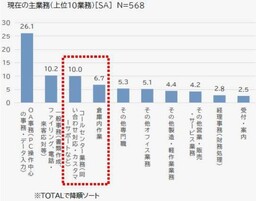 最も多い業務は「OA事務(PC操作中心の事務・データ入力)」が26.1%でした。続いて「一般事務」10.2%、「コールセンター業務」10.0%となっています。コールセンター業務と倉庫内作業の割合が比較的多いのが特徴です。