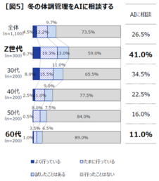 冬の体調管理についてAIに相談するかと聞くと、全体では26.5%とおよそ4人に1人が相談していることが分かりました。年代別に見ると、Z世代(15〜29歳)では41.0%と4割以上がAIに相談していますが、シニア世代はぐっと下がり60代では11.0%でした[図5]。