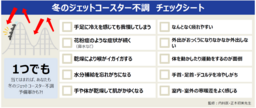 このように急変する気候の影響を受ける冬の不調のことを、当社では「冬のジェットコースター不調」と命名し、内科医・正木初美先生監修の下、「冬のジェットコースター不調 チェックシート」を作成しました。このチェックシートは全10問からなり、今の自分の状況で当てはまるものをチェックしてください。1つでも当てはまるものがあれば、あなたは「冬のジェットコースター不調」の予備軍です。