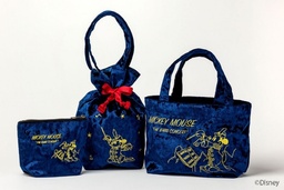 柔らかなベロア生地にミッキーマウスのゴールド刺しゅうを施した、上品さと実用性を兼ね備えたアイテム。それぞれ裏地にはサテン生地を採用し、舟形ポーチとランチトートには内ポケットが付いています。マチがあるので収納力も十分です。
