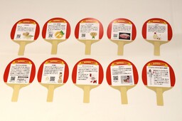 「知っトク情報」が書かれた 卓球ラケット型カード