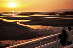 大分県内で唯一、水平線に沈む夕陽が見られる景勝地で、干潟の縞模様と夕陽が織りなす絶景スポットとして日本の夕陽百選に選定されており、干潮と日の入が重なると縞模様が浮かび上がり、美しい情景を映し出します。