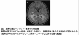 極長鎖脂肪酸は一部の細胞で利用される一方、大部分の細胞では、極長鎖脂肪酸を運ぶ特殊な輸送タンパク質の働きによって分解されます。我が国の難病に指定される副腎白質ジストロフィー(指定難病20)は、この輸送タンパク質の機能が遺伝的に不全であるために生じます。副腎白質ジストロフィーは、脳の中の炎症反応を伴う進行性の脱髄症状※6(図2)や、副腎機能の不全を特徴とする疾患です。