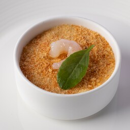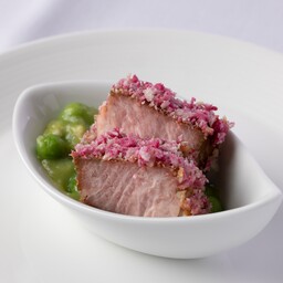 じっくりと火入れし、ジューシーに仕上げたローストポークに、桜が香るパン粉をまぶしました。鮮やかなプティポワ(グリーンピース)の煮込みと一緒にお召し上がりいただきます。