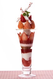 白苺と鮮やかな苺のコントラストが華やかなパフェです。苺のジュレやなめらかなガナッシュ、サクサクとしたクリスティアン※など異なるアイテムを何層にも重ねました。食べ進めるごとに変化する食感や味わいをお楽しみください。