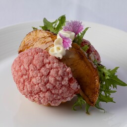 なめらかなトンナートと、フランボワーズビネグレットで和えたシーフードマリネに、ダイス状にカットした苺のジュレをトッピング。爽やかな酸味をご堪能いただきます。