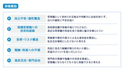 一方で、自身の適性への不安、現職管理職の働き方に対する否定的な印象、役割遂行に伴う負荷やリスクへの懸念、報酬と負担のバランスに対する不満などが挙げられます。さらに、現在の業務や専門性に対する充足感も、管理職志向を抑制する要因として作用していることがうかがえました。