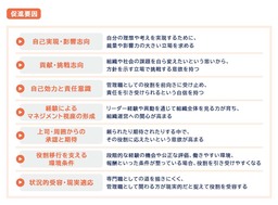 職場のキーパーソンの管理職志向に影響を与える要因を整理したところ、管理職志向を高める要因(促進要因)と、管理職志向を抑える要因(抑制要因)の双方が確認されました。