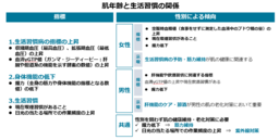 ●握力低下と日光の当たる場所での作業頻度の上昇は、男女ともに肌の老化と関連する要因として確認されました。このことから、筋力維持と紫外線対策は、性別を問わず肌の健康維持に必要となる可能性が示唆されます 。