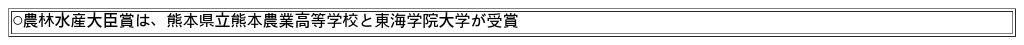 農林⽔産⼤⾂賞は、⾼校の部から熊本県⽴熊本農業⾼等学校、⼤学・専⾨学校の部から東海学院⼤学医療栄養学科『規格外野菜で⾷育の推進プロジェクトチーム』が決定しました。