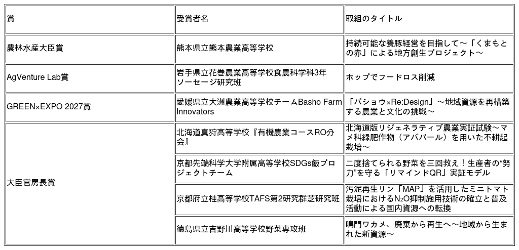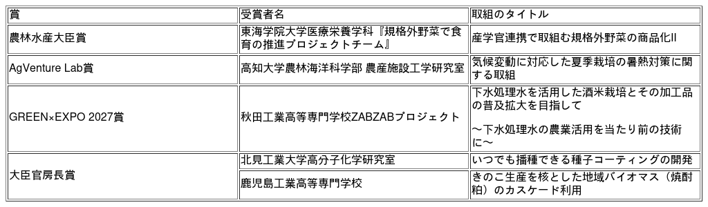今⼤会では、⾼校の部、⼤学・専⾨学校の部それぞれについて、「農林⽔産⼤⾂賞」、「AgVenture Lab 賞」、令和9年3⽉から横浜で開催される「2027 年国際園芸博覧会」の機運醸成を⽬的とした「GREEN×EXPO 2027賞」、「⼤⾂官房⻑賞」を選定しました。